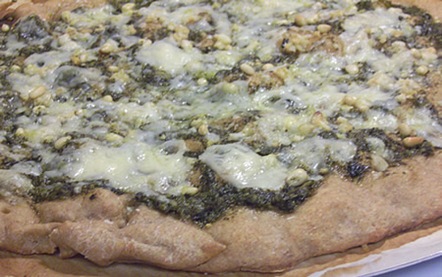 Then, I added some pesto and pine nuts. I didn’t have much in the way of toppings in my refrigerator except pizza sauce and pepperoni and I wasn’t sure if that combination would taste right with this dough. So I opted for the pesto and pine nuts instead.